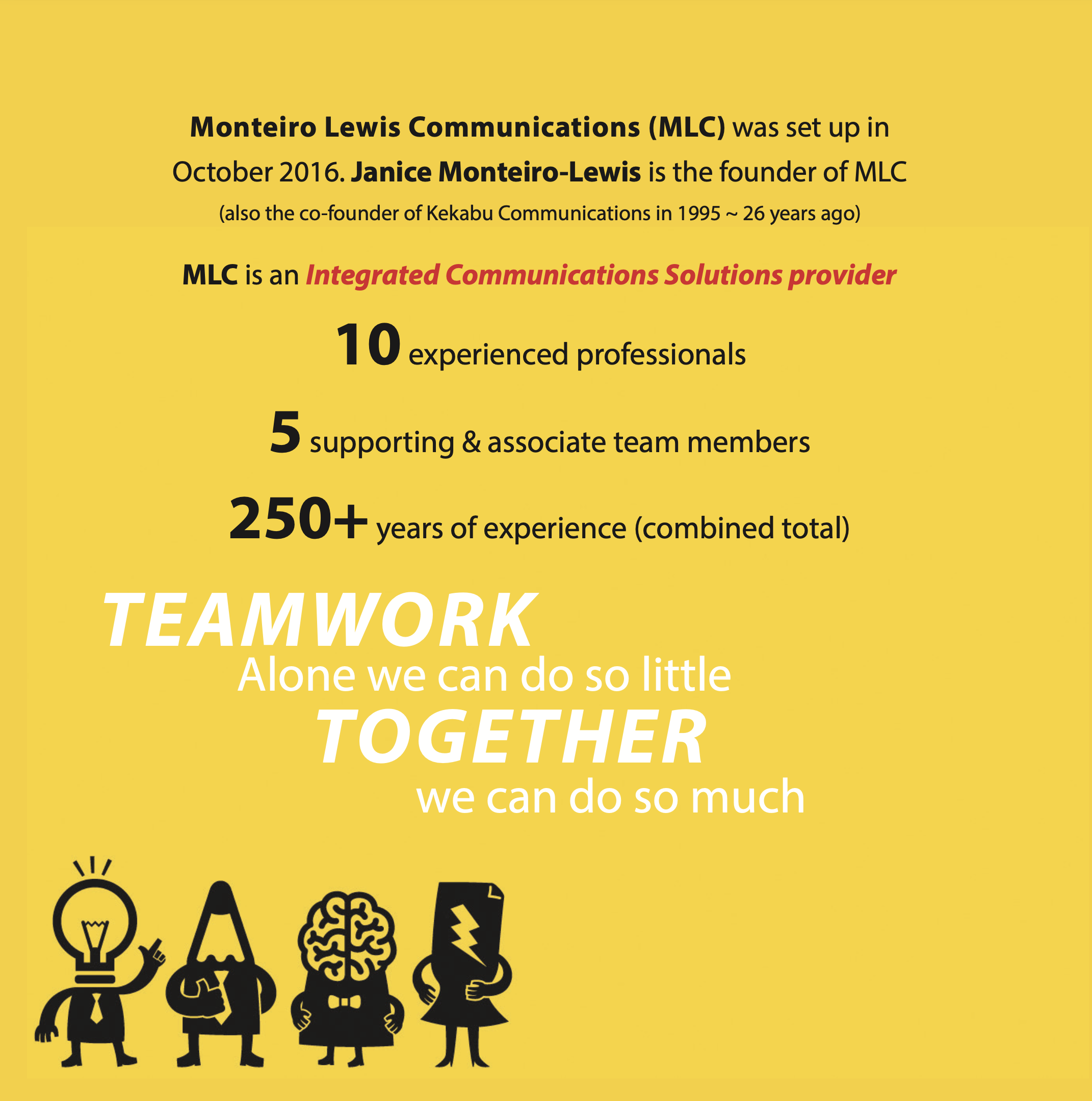 Monteiro Lewis Communications (MLC) was established in October 2016 by Janice Monteiro-Lewis, who also co-founded Kekabu Communications in 1995.